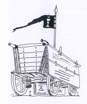 Aus Karren gebildete Wagenburgen nutzte man schon vor der hussitischen Revolution, meist stellte man diese Wagenburgen hinter den mittelalterlichen Heeren als Fliehburgen im Fall einer verlorenen Schlacht oder als Platz für die „Nichtkombattanten" auf. Die Hussiten verstärkten ihre Karren an den Seiten mit dicken Holzbohlen. „Von der Oberkante des Innenbordes bis zu den Naben-Köpfen des Rades verlief ein Kantholz, das als Auflage für die dadurch in Schräglage befindliche Schutzwand diente. Im Querschnitt gesehen bildeten Bordwand und Schutzwand also ein auf den Kopf gestelltes V, d.h. einen nahezu optimalen Schutz gegen alle Arten von direkt aufprallenden Geschossen“[26]. (Abb. 12).