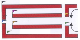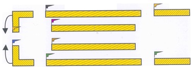 Die Länge einer Kolonne mit Kampfkarren konnte mehrere Kilometer betragen. Sie quälte sich durch das Gelände auf unbefestigten Wegen (Abb. 13). Das Auffahren musste gut organisiert sein. Die Karren, hinter denen sich die folgenden Wagen beim Zusammenfahren zur Wagenburg schnell einzureihen hatten, waren mit Positionsfahnen gekennzeichnet. Erst mussten die Schmalseiten auffahren, dann die Längsseiten (Abb. 14 - 16). Nach dem Auffahren, dem Ausspannen und dem Schließen der Lücken wurden die Geschütze auf die dem Feind zugewandte Seite gebracht. Diese Kammergeschütze erlaubten, wie oben geschildert, das Bedienen der Waffen auf den Fahrzeugen ohne vor die Karren treten zu müssen. Innerhalb der Wagenburg hielten sich an den Toren die Reserve zu Fuß und in der Mitte die Reiterei auf (Abb. 17). Die Hussiten erwarteten ihre Gegner, ließen sie durch die Geländehindernisse langsam werden, eröffneten das Salvenfeuer mit Geschü̈tzen, Büchsen und Armbrüsten. Drangen Schwerbewaffnete bis an die Karren vor, fegte man sie mit den eisenbeschlagenen Drischeln oder mit den Stangenwaffen von den Pferden. Brachen Feinde wider Erwarten in die Ordnung der Wagenburg ein, wurden sie von zwei Seiten angegangen. Manchmal schon beim Erschallen der hussitischen Kriegsgesänge, begleitet von Trommel- und Dudelsackmusik[27] flohen die Gegner in der Regel aber spätestens beim Auftreffen auf die Hindernisse und bei der Feuereröffnung. Die Hussiten öffneten danach die Tore, die leichten Reiter fielen den schwerbewaffneten Reitern in den Rücken oder in die Flanke, das hussitische Fußvolk übernahm den Rest (Abb. 18).