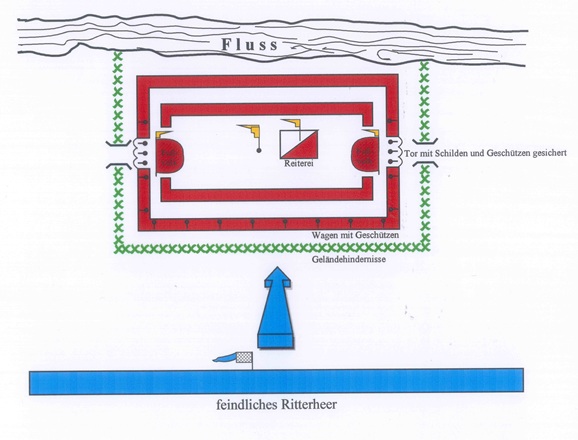 möglich, zogen sie mehrere Mauerringe, insgesamt höchstens vier. Eingänge wurden meist an den schmalen Seiten gelassen. Die Tore und die Lücken zwischen den Wagen schützten sie mit Setzschilden. Das Gelände vor den „Wagenwällen" verstärkten die Verteidiger mit Gräben, Balken, spitzen Pflöcken oder Stolperhindernissen. Ähnlich wie noch im II. Weltkrieg bei der Artillerie das Instellung-Gehen einen großen Schwächemoment darstellte, war das Auffahren zur Wagenburg und das Herstellen der Verteidigungsbereitschaft der schwächste Moment des Systems Wagenburg. Wir werden das bei Hiltersried sehen.