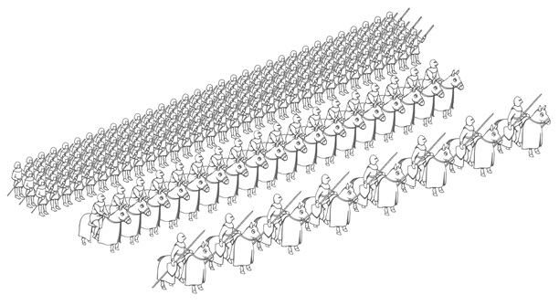Dem Keil folgen die restlichen 165 Reiter in elf Gliedern breiten und sechzehn tiefen Rechteck.