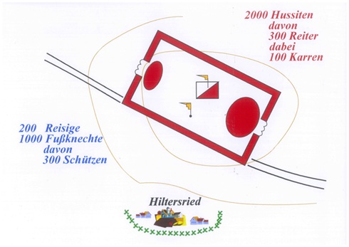 Die Bö̈hmen versuchen, bei Hiltersried „an dem Berg" zur Wagenburg aufzufahren. In der Geschichtsschreibung gilt der Hussitenbirl als Ort der Schlacht. Ein paar hundert Meter südlich des Denkmals, das im 20. Jahrhundert aufgestellt wurde, fahren die Hussiten auf. Die Längsseite weist in Richtung der größten Gefahr - nach Hiltersried. Die Eingänge waren dann zweckmäßigerweise an den Schmalseiten, hier erwartet man den Feind nicht, hier aber kann der Feldhauptmann die Hussiten überraschen. Man hat die rechteckige Form der Wagenburg gewählt, so kann man schneller auffahren als bei der ovalen Form (Abb. 24).