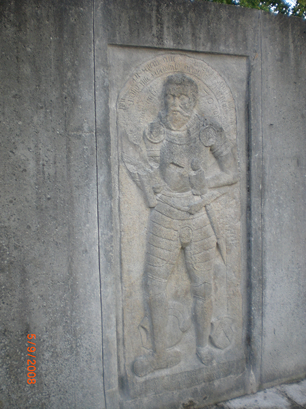 Dieses Bild zeigt das einzig in Geigant erhaltene historische Relikt - den Epitaph eines Kagerers, fotografiert um 1955, an der Nordseite der inzwischen abgerissenen alten Geiganter Kirche.