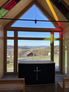 Die etwas ältere Tochter Hannah meinte dazu, für sie sei es der schönste Ort, denn wenn die Sonne durch das farbenfrohe Glasband scheint, erinnert sie sich jedes Mal daran, dass sie selber diese bleiverglaste Glaskunst aussuchen durfte. Zisler meinte, dass ohne die vielen ehrenamtlichen Helfer das Kirchlein sicher nicht in dieser Art und Bauweise zustande gekommen wäre. Die aus massiver Eiche gefertigten Sitzbänke und ebenso der massive Eiche-Altar laden die Besucher ein, sich hier nicht nur auszuruhen, sondern auch in die Schönheit der Kapelle, die schöne Landschaft und vielleicht auch ins Gebet zu versenken.