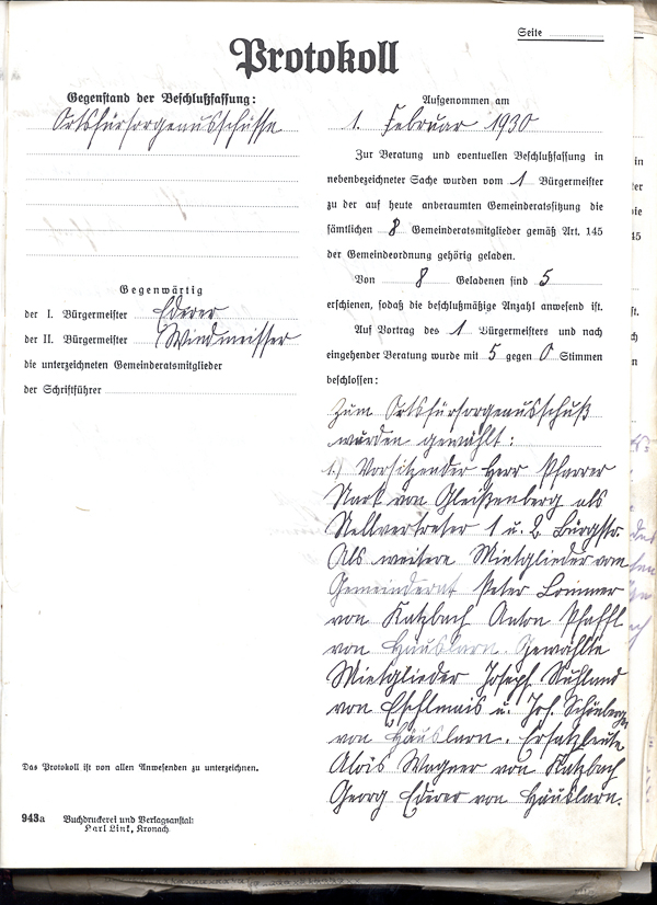 Einen Zuschuß für die Autospritze lehnt der Gemeinderat Katzbach ab indem die Hälfte der Gemeinde nicht genügend Wasser hat, und auch zu den meisten Ortschaften nicht fahrbar ist.