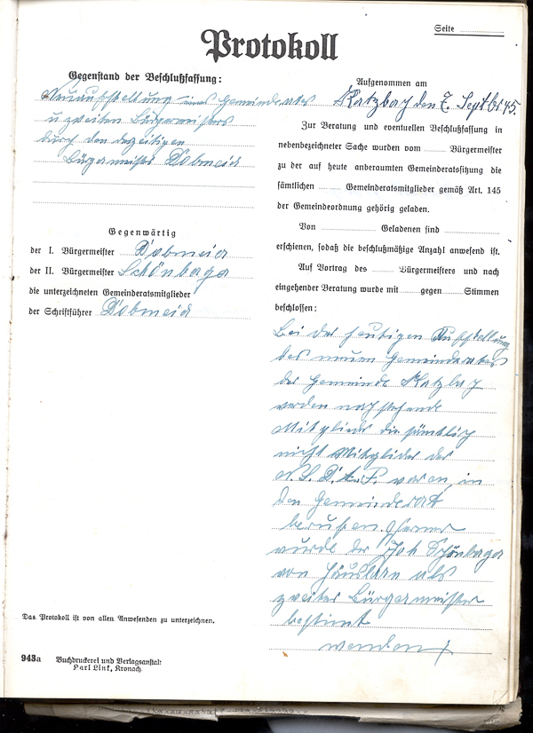 Bei der heutigen Aufstellung am 7. 9. 1945 des neuen Gemeinderates Gemeinde Katzbach wurden noch folgende Mitglieder die sämtlich nicht Mitglieder der N.S.D.A.P. waren in den Gemeinderat berufen. Ferner wurde der Joh. Schönberger von Häuslarn als zweiter Bürgermeister bestimmt.