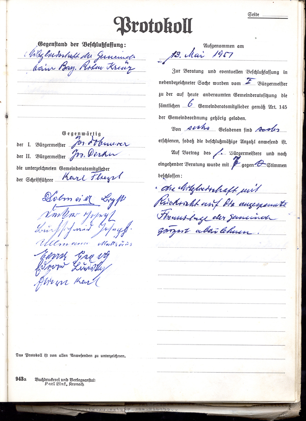 Die Mitgliedschaft beim Bayerischen Roten Kreuz wird mit Rücksicht auf die angespannte Finanzlage der Gemeinde zur Zeit abgelehnt.