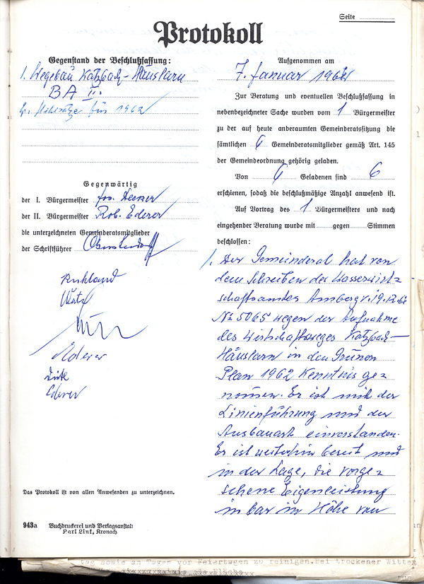 Der Gemeinderat hat von dem Schreiben des Wasserwirtschaftsamtes Amberg v. 19. 12. 1961 No. 5065 wegen der Aufnahme des Wirtschaftsweges Katzbach – Häuslarn in den Grünen Plan 1962 Kenntnis genommen. Er ist mit der Linienführung und der Ausbauart einverstanden. Er ist weiterhin bereit und in der Lage, die vorgesehene Eigenleistung in bar in Höhe von 15.000 DM zeitgerecht zu erbringen. Gleichzeitig beschließt der Gemeinderat einen Antrag an das Wasserwirtschaftsamt Amberg zwecks Aufnahme des Verbindungsweges Katzbach (Abzweigung von der Teerstraße Katzbach – Häuslarn) Kühnried ca. 450 mtr. In den Grünen Plan 1962 der auch mit einer Teerdecke ausgebaut werden soll.