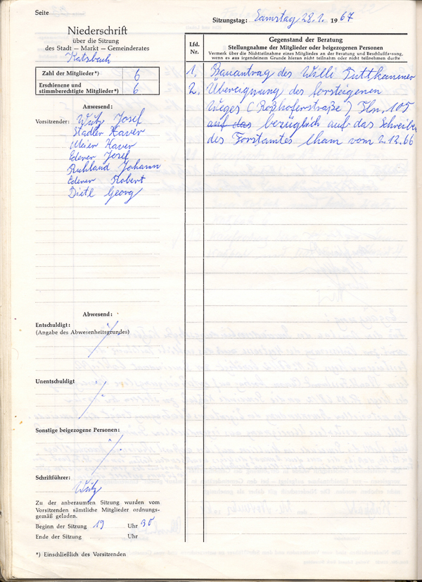 Der Gemeinderat Katzbach hat Kenntnis vom Inhalt der Urkunde  vom 19. Januar 1967 UR No 48,47 des Notars Dr. Franz Höchtl in Waldmünchen und genehmigt diese Urkunde in allen Teilen.