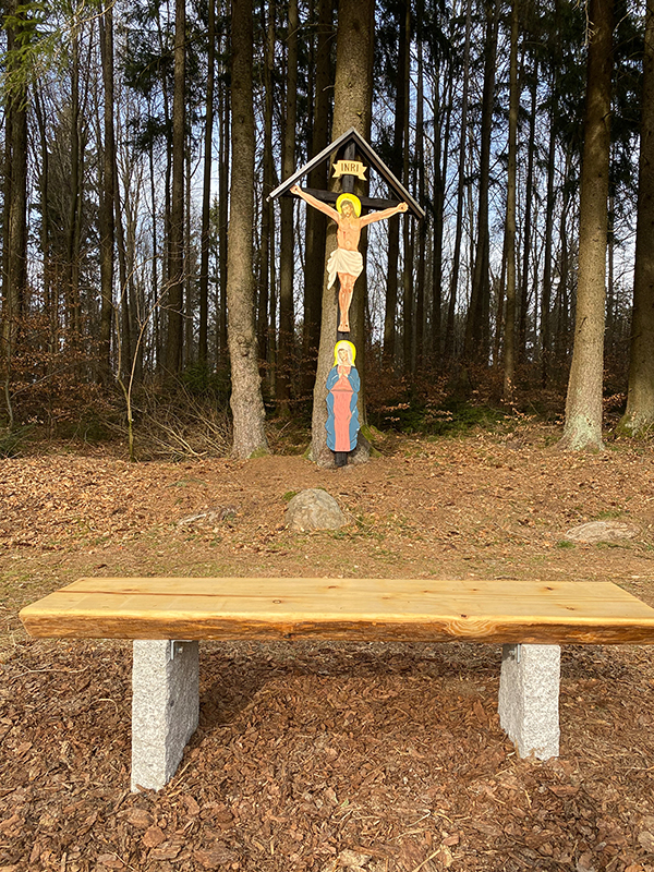 Viele Tage musste das Ehepaar Feiner opfern, um das Ensemble so zu gestalten, dass es auch für Wanderer und Grund-Anlieger ein ansehnliches Gesicht bekam. Dazu setzten die Feiners gegenüber dem Kreuz zwei senkrechte Granitsteine, die eine Holzbank tragen. Auf der könnte man sich sitzend und vielleicht auch betend dem Herrgott mit seiner Schöpfung widmen.
