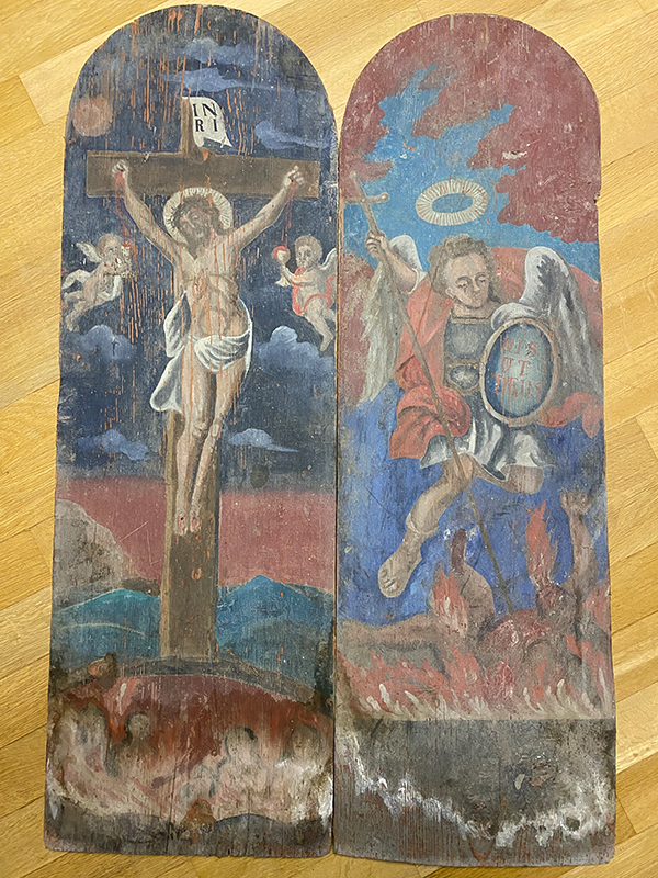 Er ist Hobbymaler und nahm sich der Aufgabe gerne an. Der „Hoimerl“ mit seiner Frau Sonja fuhren dann im letzten Winter mit den alten verblassten und verwitterten Holztafeln zu ihm nach Würzburg, um ihn darum zu bitten, die Mutter Gottes und den Gekreuzigten wieder neu zu fassen. Drei Tage danach schickte Stumpf schon die ersten Fotos von seinen Entwürfen auf den neuen Holztafeln.