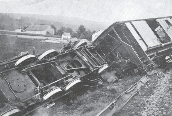 Im Hintergrund sehr gut sichtbar links oben der Stadel vom Bog, rechts über dem verunfallten Zug die Dorfkapelle und der Roßbauernstadel, seinerzeit noch ohne Zufahrt zur oberen Tenne.