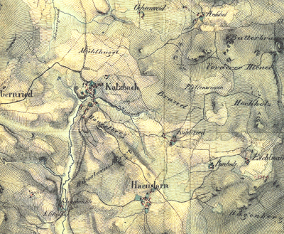 Eine weitere sehr interessante Karte angefertigt im Jahre 1850 durch Hauptmann Hermann von Schintling und Oberlieutenant G.v.Tein 1851 als Terainnaufnahme zeigt hier im Ausschnitt das ehemalige Gemeindegebiet Katzbach.