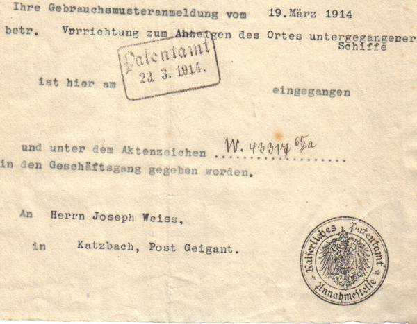 Am 19.03.1914 erfolgte beim kaiserlichen Patentamt in Berlin die Patentanmeldung „Vorrichtung zum Anzeigen des Ortes untergegangener Schiffe“.