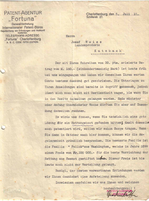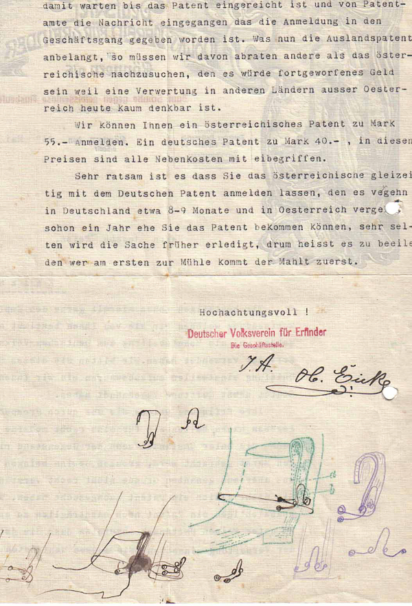 Ein umfangreicher Schriftverkehr, vor allem mit dem beratenden Ingenieur für Patentwesen sowie dem Deutschen Volksverein für Erfinder lassen erkennen, wie schwierig es war, eine zum Patent angemeldete Erfindung auch zu vermarkten.