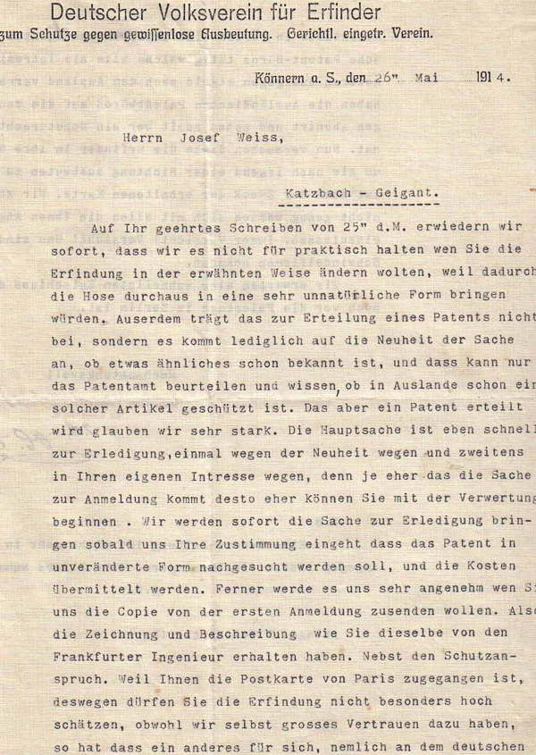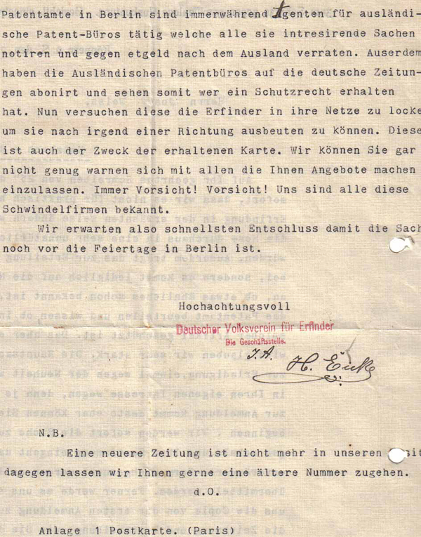 Schreiben des Deutschen Volksvereins für Erfinder