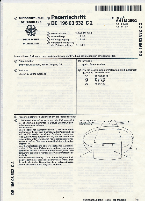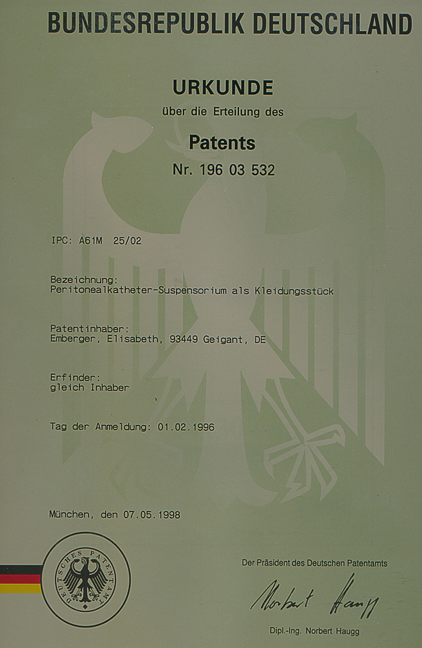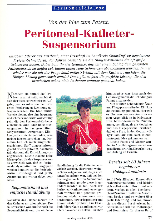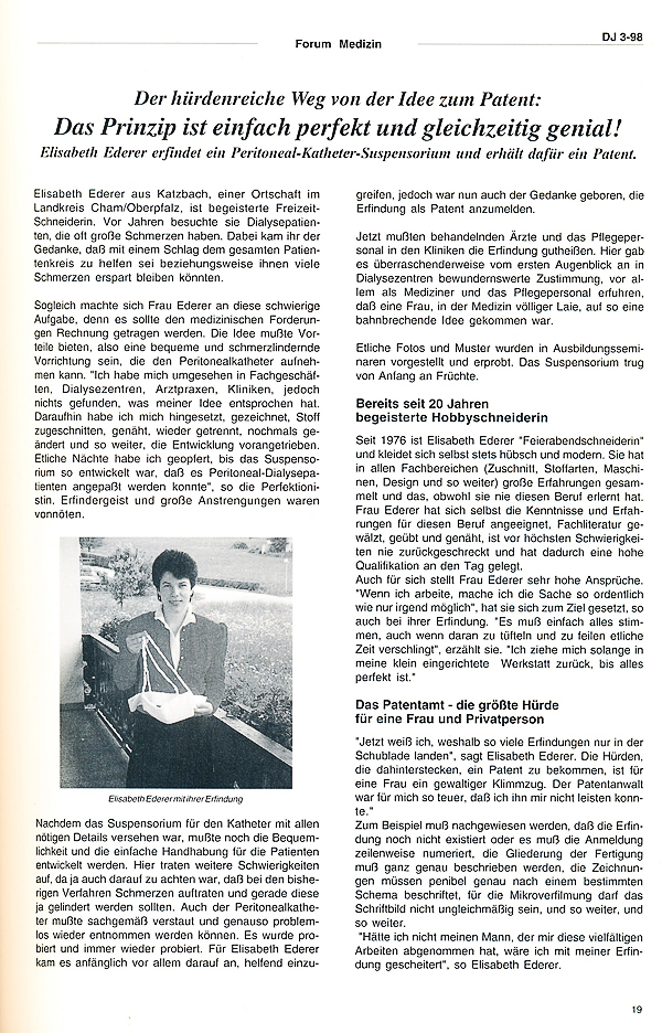 1998 erhält Elisabeth Ederer, Katzbach 33, ein Patent für die Erfindung eines Peritoneal-Katheter-Suspensoriums für Dialyse-Patienten.