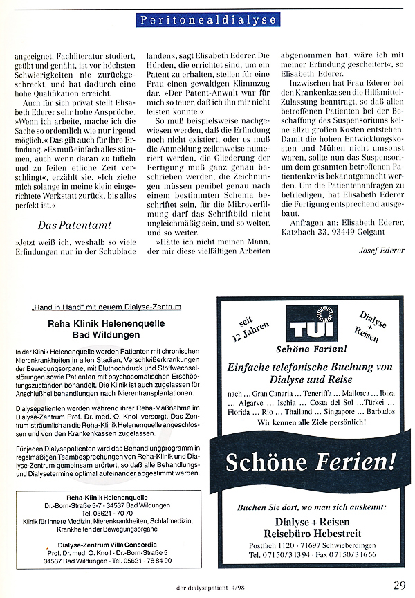 In den Dialysefachzeitschriften "Diatra Journal 3-98" und „der dialysepatient“ 4 vom Juli 1998 wurde ihre Erfindung von der medizinischen nephorologischen Fachwelt ebenfalls als bahnbrechende Innovation gewürdigt.