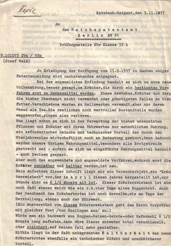 Verfahren zur Herstellung von Volks-Heilkräuter-Nahrung - 1937