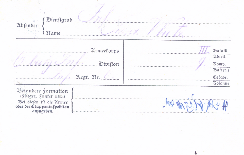 Feldpostbrief von Wutz Franz vom 11. 1. 1917, Rückseite, Katzbach 20