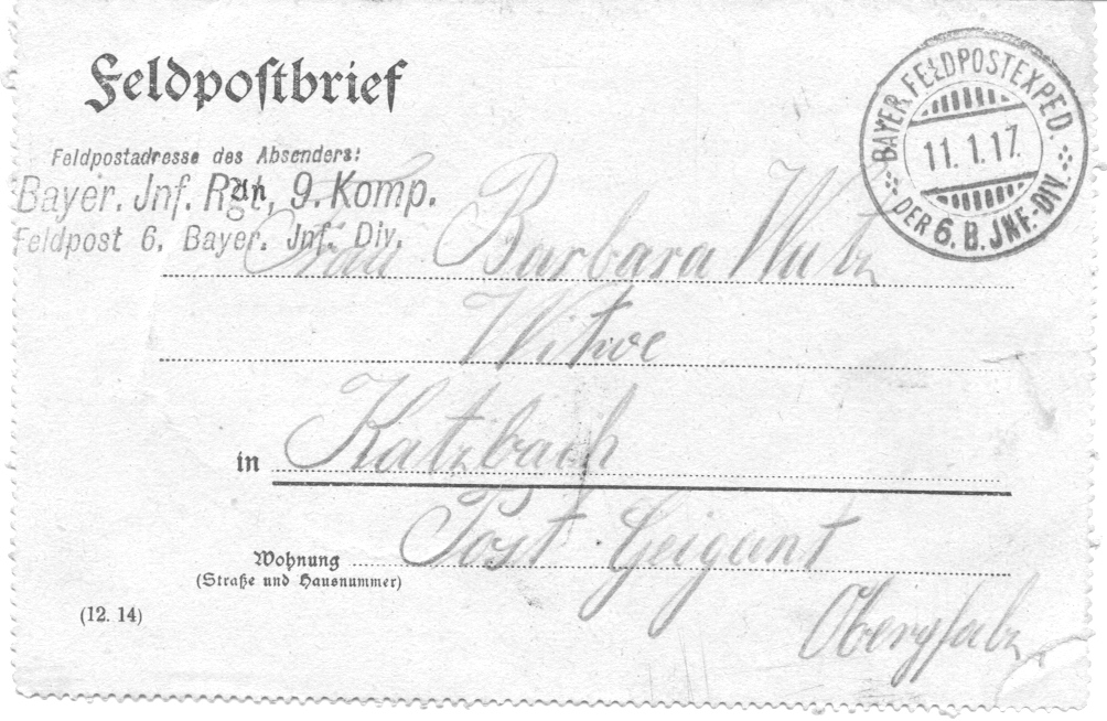Feldpostbrief von Wutz Franz vom 11. 1. 1917, Katzbach 20