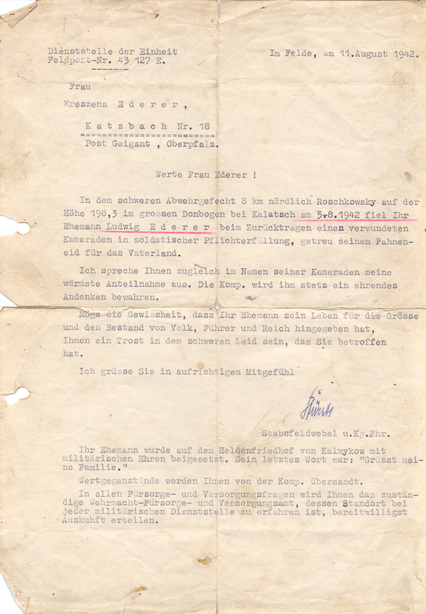 ![]() Benachrichtung Ludwig Ederer Katzbach 18, dass er gefallen ist