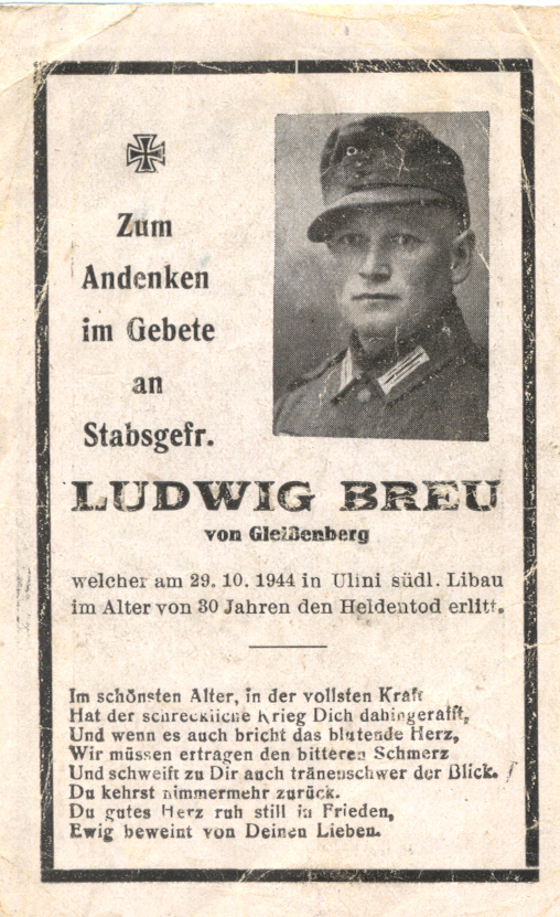 ![]() Ludwig Breu, Sterbebild, er war Knecht auf dem Engelhardt-Hof Rosshof 2 1/2 und stammte aus Gleissenberg