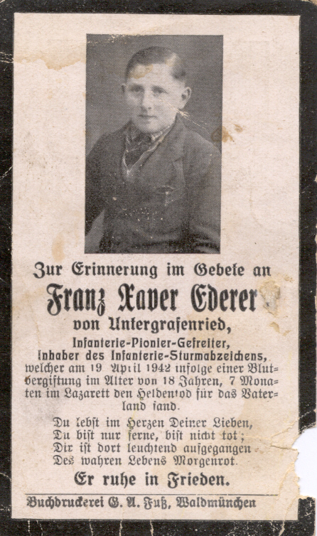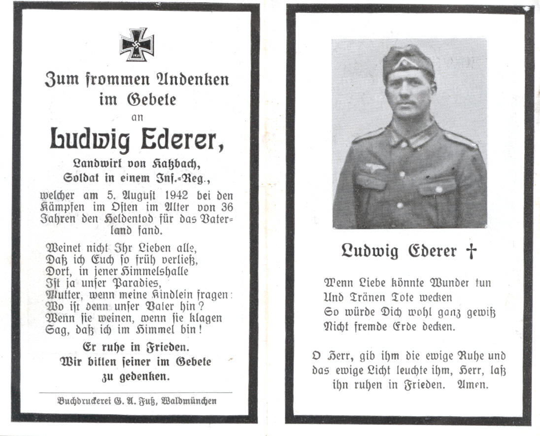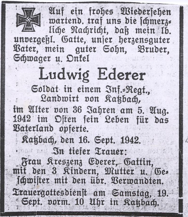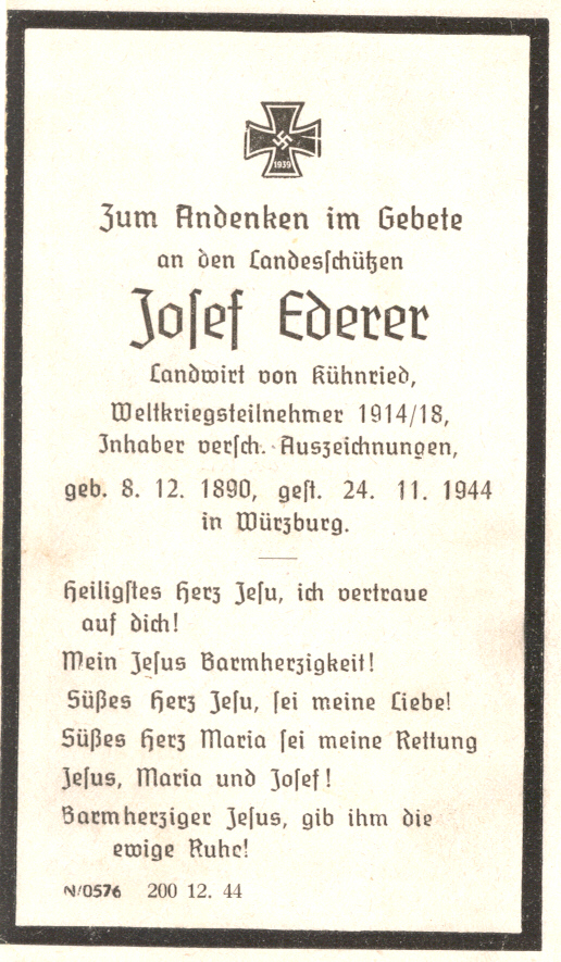 ![]() Ederer Josef, Kühnried 5, ehemaliger Katzbacher Bürgermeister, nach dem Einzug zur Wehrmacht in Würzburg verstorben