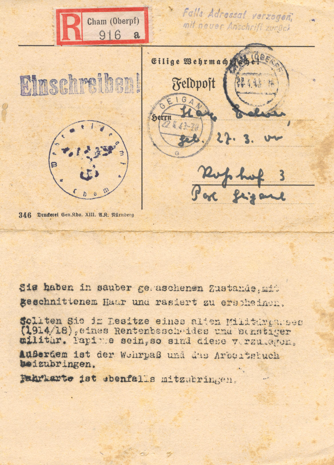 ![]() Ederer Max, Rosshof 3, Musterungsaufforderung Rückseite