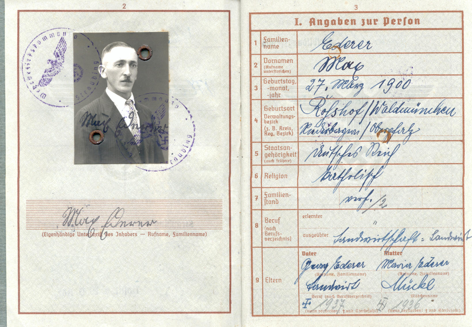 ![]() Ederer Max, Rosshof 3, Wehrpass, er wurde jedoch nicht mehr zur Wehrmacht eingezogen