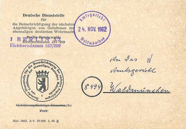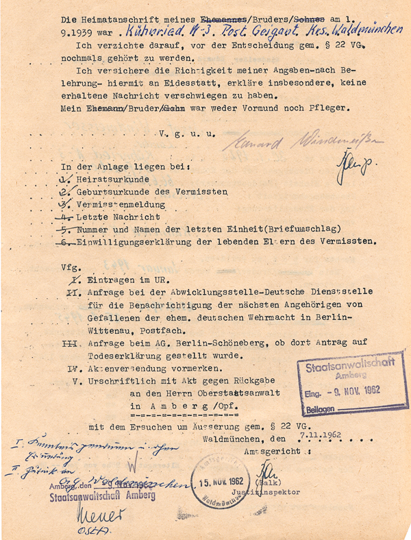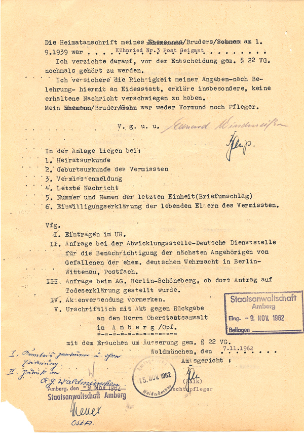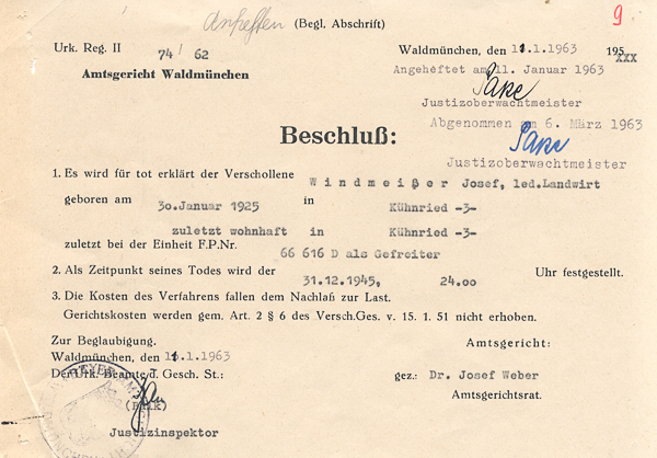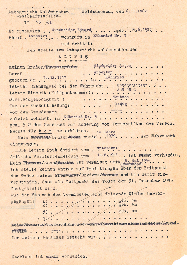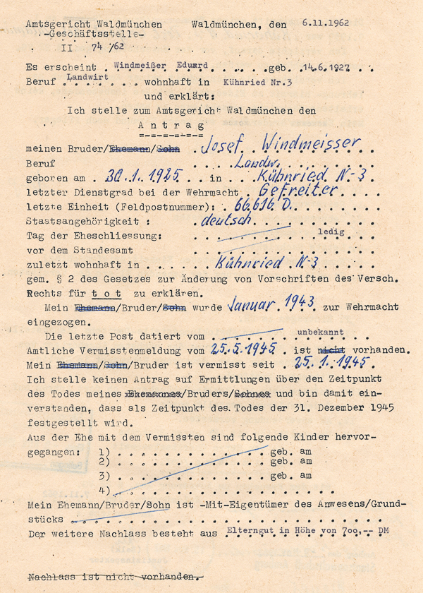 ![]() Windmeisser Anton, Verfahren Toterklärung des Vermissten bzw. Verschollenen Soldaten