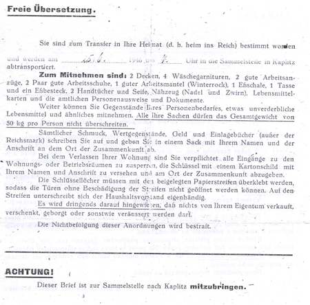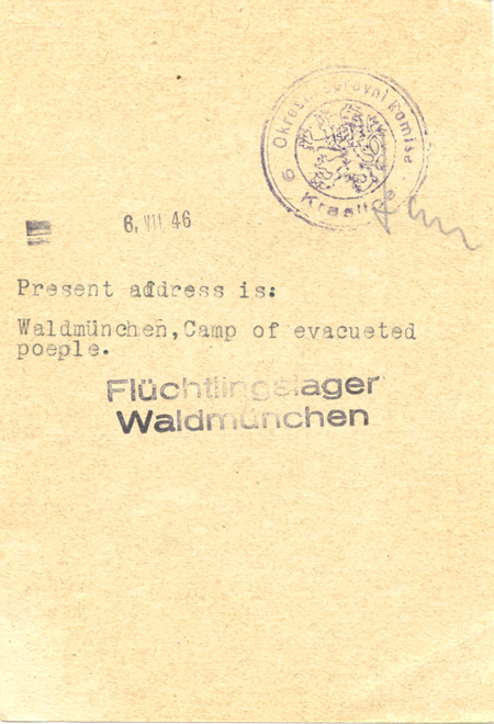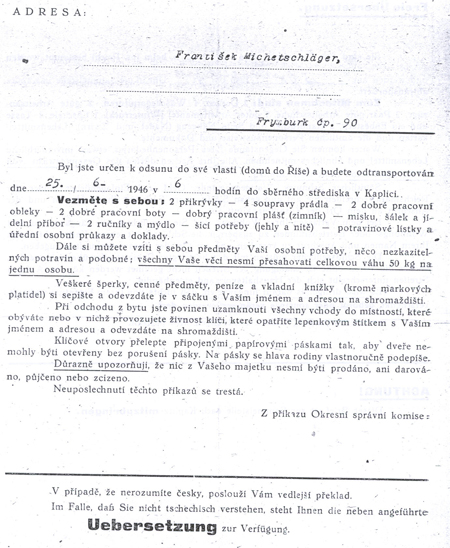 Mit diesem dreisprachigen Zettel in der Hand verließen die Vertriebenen Graslitz, die ehemalige Heimat und wurden damit ins Lager Waldmünchen überstellt