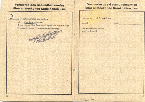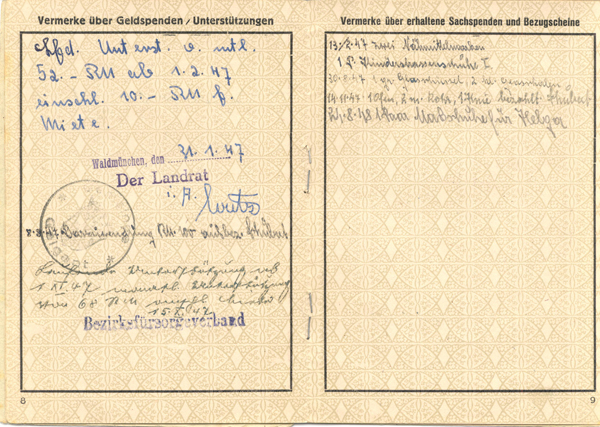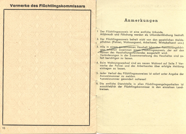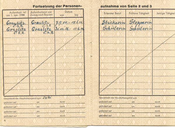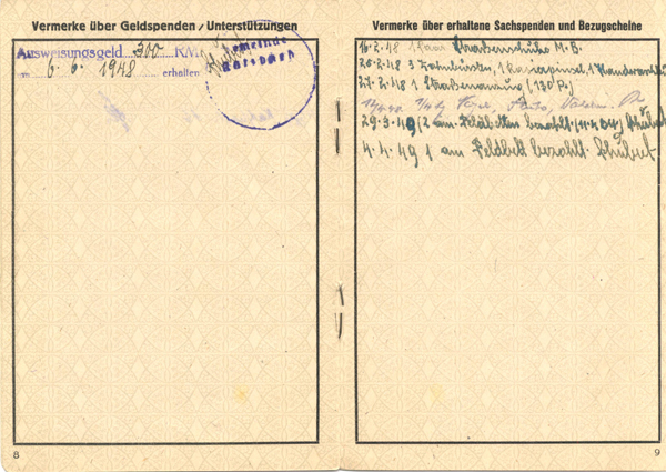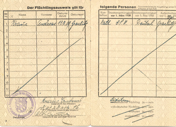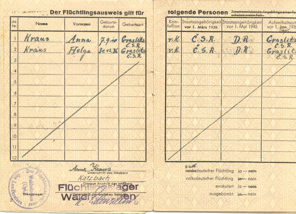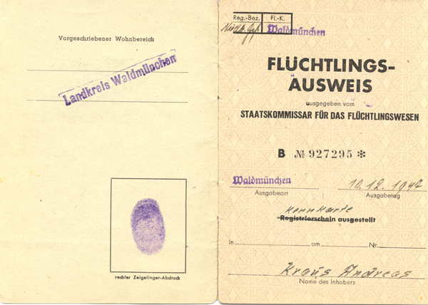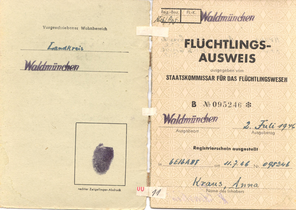 Die Flüchtlingsausweise vom Ehepaar Andreas und Anna Kraus sowie Kind Helga