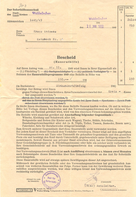 Hier der Haushaltshilfebescheid für die Flüchtlingsfamilie Andreas Kraus