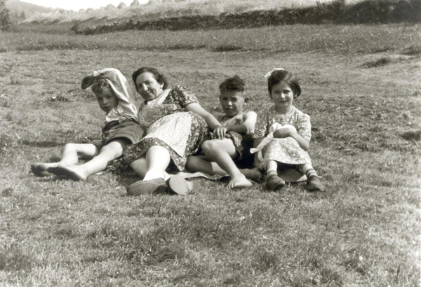 Frau Anna Kraus mit den Kindern Hermann Lommer, Peter Lommer (Scholler)  und Angela Daschner, heute Bauer (Denzl Angela mit den Holzschuhen). Am oberen Bildrand sind noch Kornmandl sichtbar.