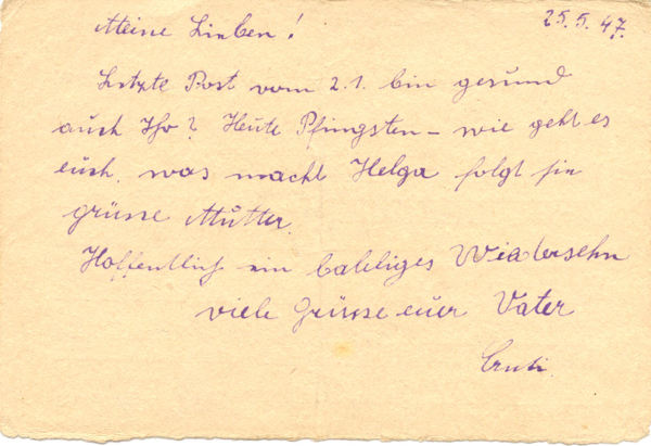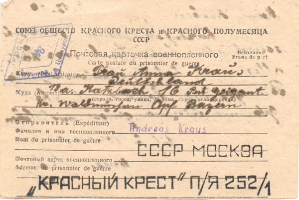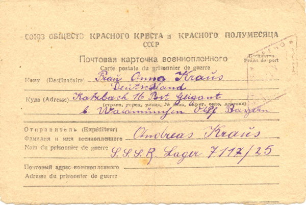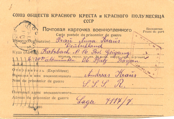 Für die Ehefrau Anna Kraus war es vermutlich eine Erlösung, als sie aus dem Kriegsgefangenenlager Post von ihrem noch lebenden Ehemann erhielt. Die erste datiert zum 4. 12. 1946, die nächste vom 25. 5. 1947 und die letzte Nachricht vom 10. 10. 1947