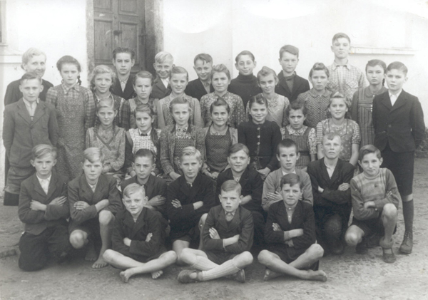 Klassenfoto vor der Geiganter Schule mit Hans Watzl