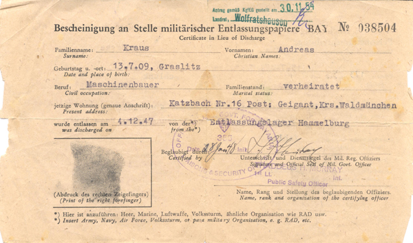 Militärische Entlassung Andreas Kraus vom 4. 12. 1947
