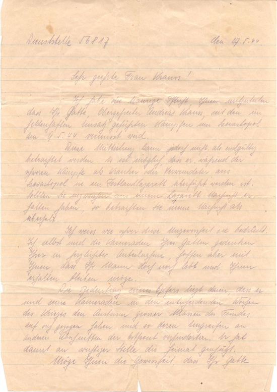 Vermisstenmitteilung Kraus Andreas 27. 5. 1944