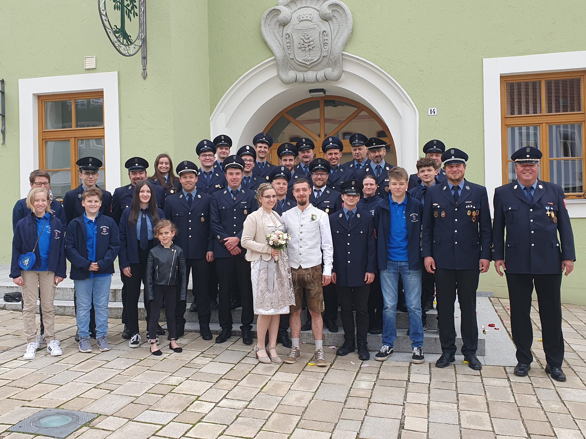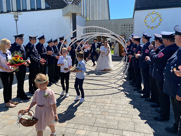 Die Sportgemeinschaft Katzbach und die Freiwillige Feuerwehr Katzbach ließen es sich nicht nehmen, in großer Zahl vor dem Waldmünchner Rathaus auf das frisch vermählte Brautpaar zu warten und bildeten dazu ein wirklich großes Spalier, mit Schlauchspirale und kleinen Präsenten für das frisch getraute Paar.