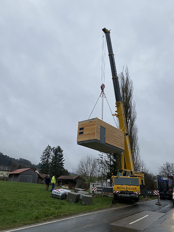 Bereits zwei Wochen früher wurde dafür ein entsprechendes Fundament betoniert und vorbereitet. Dieses wurde auf 3 mm genau justiert, sodass das Verteilerhäuschen ohne Probleme aufgesetzt werden konnte. Bereits vor 7 Uhr früh war der überbreite Tieflader der Spedition Dietz vor Ort und gleich danach kam auch ein vierachsiger großer Autokran der Firma Mühlbauer auf die Baustelle. Nachdem die Verkehrssicherung auf der Staatsstraße installiert war, begann das Versetzen des Knoten-Häuschens.