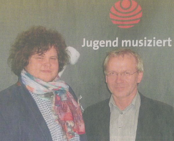 Abgebildet ist Florian Gruber aus Kühnried mit seinem Lehrer Hermann Seitz von der Landkreismusikschule Cham im Foyer der Stadthalle Braunschweig, dem Austragungsort des Wettbewerbs.
