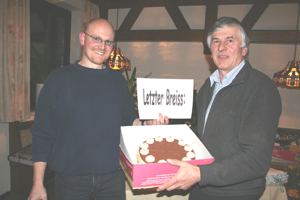 Anschließend schritt er zur Siegerehrung. Den Sonderpreis, eine Zwölfteilertorte als letzten Breiss, hatte sich mit Schlemmerauge, ruhiger Hand und knurrendem Magen Stadtrat Egid Bauer aus Katzbach gesichert und damit einmal mehr die Worte Senecas bewahrheitet: