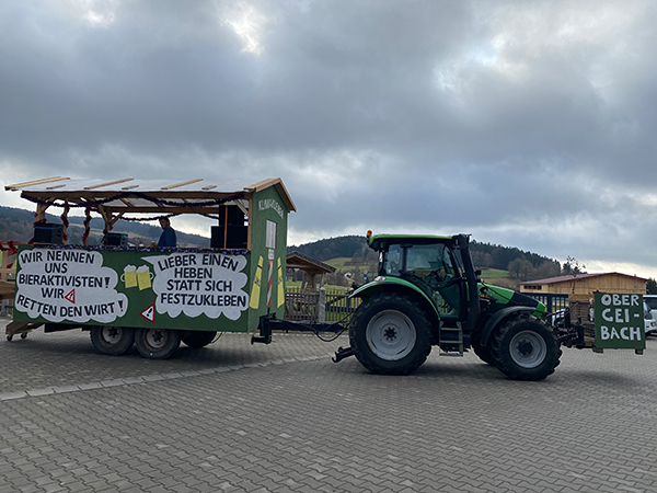 Der groß sichtbare Titel "Obergeibach" was sicher mit den Ortschaften Geigant, Katzbach und Obernried in Verbindung gebracht werden kann, wurde sorgfältig ausgewählt. Ebenso die Beschriftung "Bieraktivisten, Klimakleber, Uhu und Wirt-Retter".