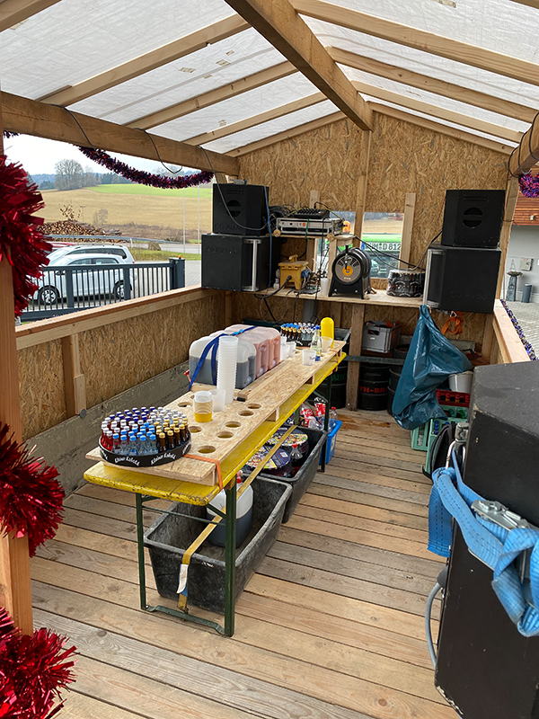 Bevor es jedoch nach Rötz ab ging, wurde im Aufenthaltsraum der Zimmerei Stefan Zisler am Vormittag ausgiebig gefrühstückt mit Weißwürsten, Brezen und vielerlei Getränken. Die Holzplatten, Werkzeuge, Schrauben, Kabel, und sonstige notwendige Utensilien hat die Katzbacher Zimmerei Zisler zur Verfügung gestellt.