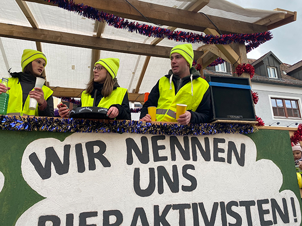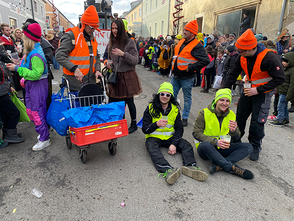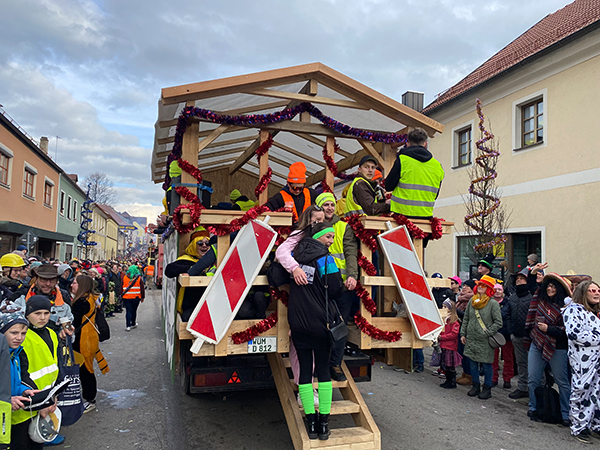 Eine überörtliche Gemeinschaft von jungen Leuten hat in vielen Stunden gebaut, gestrichen, geschraubt, gehobelt, bis das Gefährt am Nachmittag des 13. 2. 2024 im Rötzer Faschingszug mitmachen konnte.
