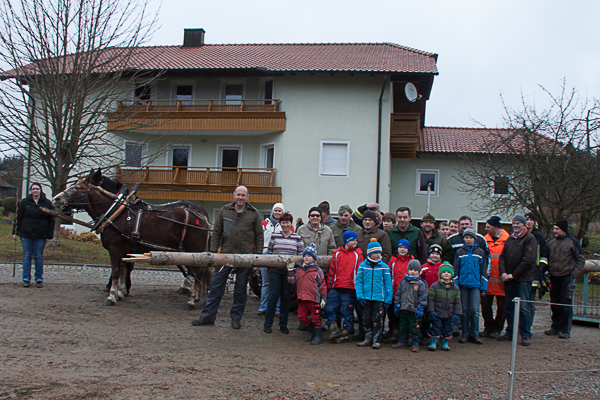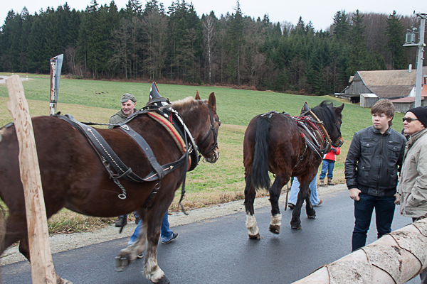 Dort angekommen wartete bereits der Schulhansl aus Geigant mit seinen 2 Rössern, und seinen beiden Töchtern, die dann die Zugtiere eingeschirrten und das Baumfuhrwerk anspannten.