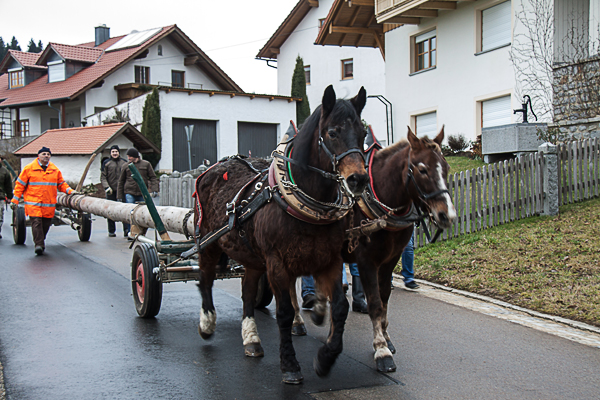 Aber woher Zugpferde nehmen und nicht stehlen? FFW-Vorstand Schichl organisierte Erwin Ederer vulgo Schulhansl aus Geigant, der zusagte, mit seinen 2 Rössern den Baum zu transportieren. Um nicht Polizeischutz anfordern zu müssen, wurde mit einem Traktorfuhrwerk unter der Absicherung der örtlichen Feuerwehr der lange Baum von Katzbach bis zur Darsteiner Kreuzung transportiert.