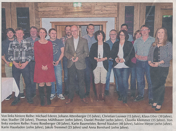 Zehn Jahre: Karin Hausladen, Daniel Prexler, Sabine Meyer, Michael Lankes, Thomas Mühlbauer, Anna Bernhard. 15 Jahre: Claudia Klemmer, Christian Lausser. 20 Jahre Jaroslav Baroch, Albert Baumann. 25 Jahre Jakob Tremmel. 30 Jahre Max Stadler, Klaus Eiber, 35 Jahre Johann Attenberger, Franz Rossberger. 40 Jahre: Bernd Stauber