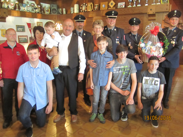 Der Jubilar mit seinen 5 Enkelsöhnen, seiner Ehefrau Franziska und Abordnungen der SG und der FFW Katzbach