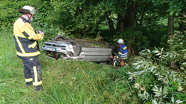 Dem nicht genug. Genau zur rush hour um ca. 8 Uhr früh am 21. 7. 2020 überschlug sich ein PKW, der von Katzbach aus Richtung Klinglmühle unterwegs war, in Richtung Bach mehrmals, kam auf dem Dach zu liegen und die beiden Insassen konnten Gott sei Dank das Fahrzeug ohne nennenswerte Verletzungen aus eigener Kraft verlassen. Da das Fahrzeug direkt neben dem Bach zu liegen kam, war zu prüfen, ob nicht Öl und andere gefährliche Flüssigkeiten ausliefen und sowohl Erdboden als auch das Fischwasser verseuchen würden. Beteiligt war neben Notarzt auch der Rettungswagen, der vorsichtshalber alarmiert wurde. Auch hier musste die Katzbacher Wehr den Verkehr regeln bzw. umleiten, die Straße saubermachen, Hilfe beim Abtransport des geschrotteten Autos leisten und den landwirtschaftlich genutzten Grund von den Bruchteilen und Scherben säubern, sodaß dieser wieder bearbeitet werden konnte.